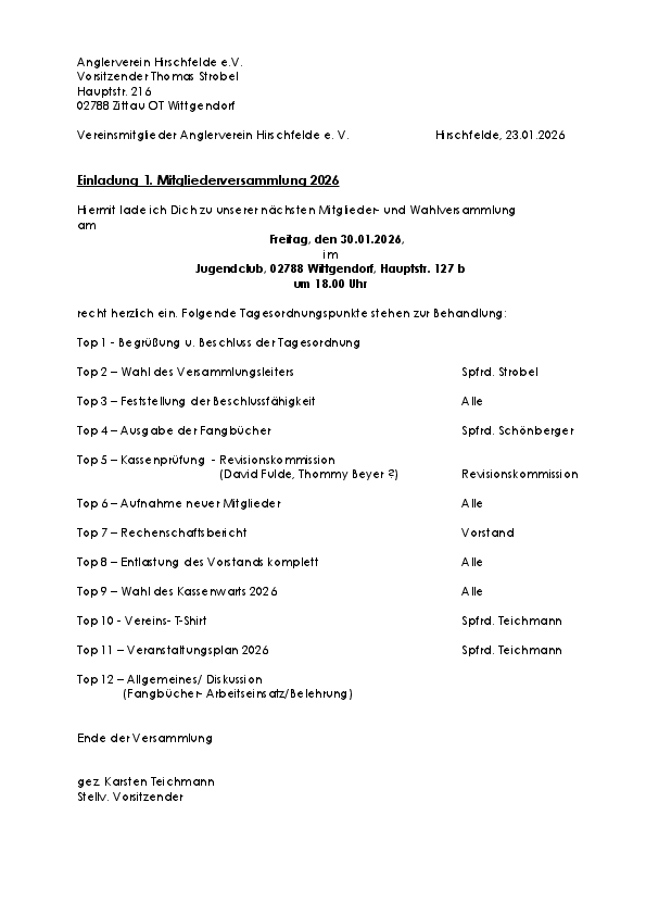 Beginn: 18:00 Uhr im Wittgendorfer Jugendclub Wichtig: Bitte an die Beitragsüberweisung denken!Informationen vom Anglerverband "Elbflorenz" Dresden e. V.